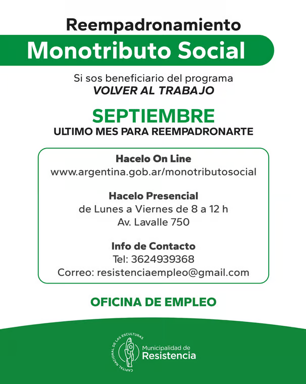 La Oficina de Empleo de la Municipalidad de Resistencia recuerda que este mes de septiembre vence el plazo para el reempadronamiento en el Monotributo Social; trámite que resulta obligatorio para los beneficiarios del programa de reinserción laboral.